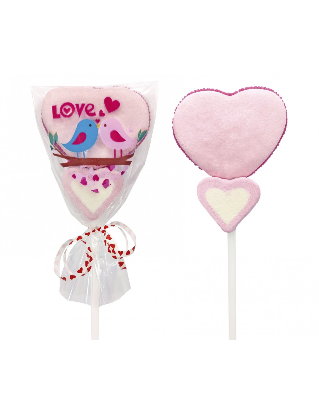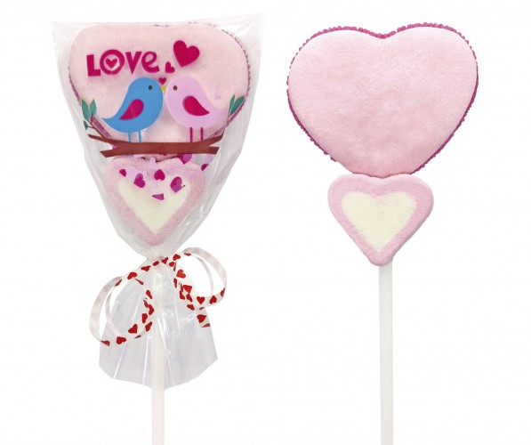 Skewer made up of two marshmallow hearts, one large with sugar sprinkles around it and a smaller one underneath. It is wrapped in a clear plastic bag with a drawing of some lovebirds, tied with a white ribbon with red hea