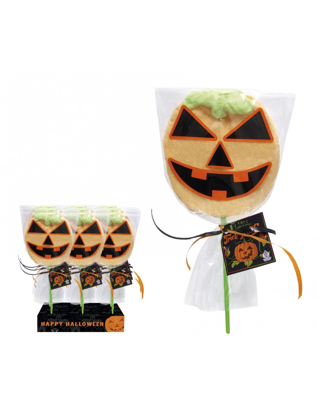 Green and orange marshmallow lollipop shaped like a pumpkin. The bag is decorated with the pumpkin's face.