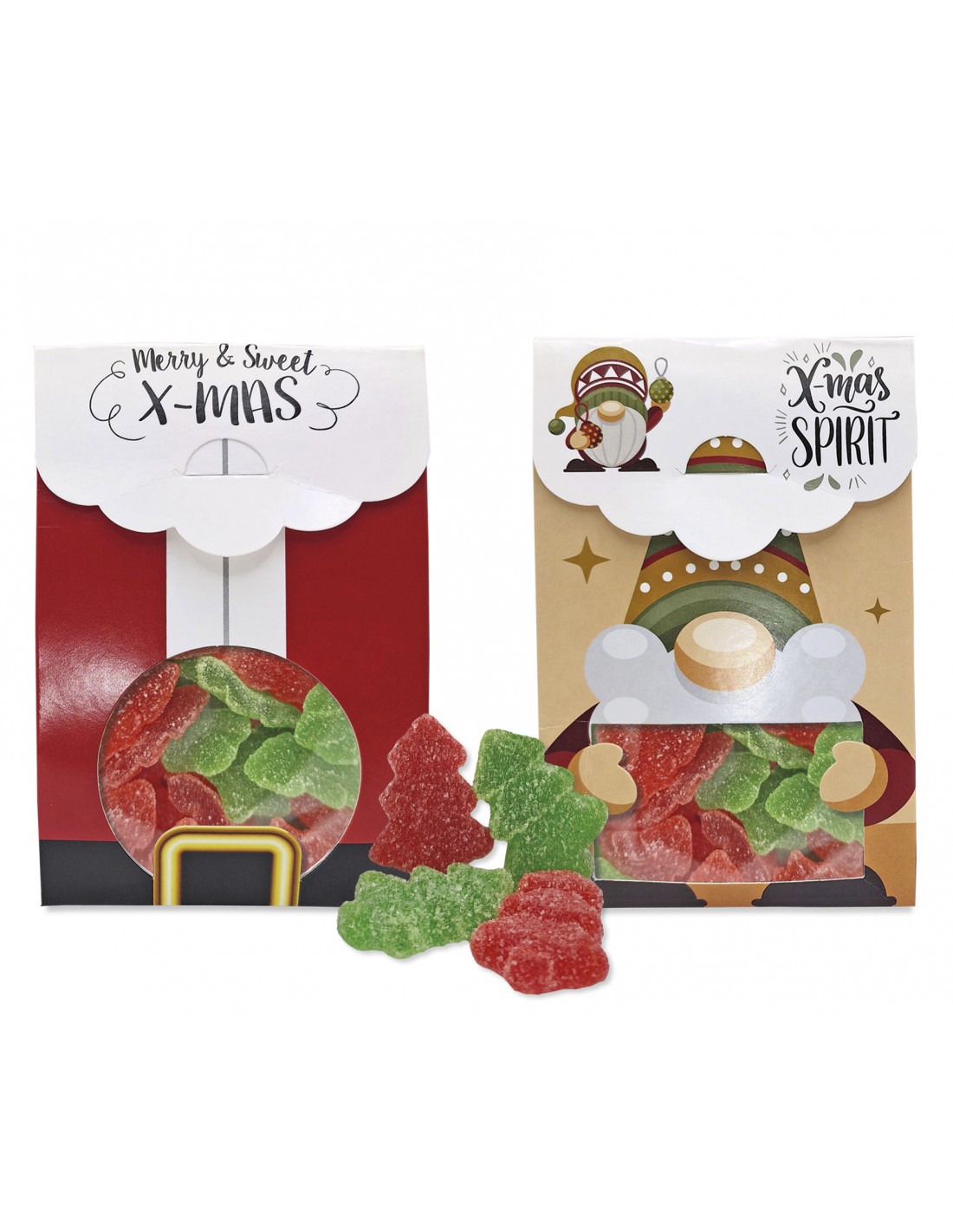 Little boxes filled with red and green gummy fir trees, one shaped like Santa's body and the other shaped like an elf.