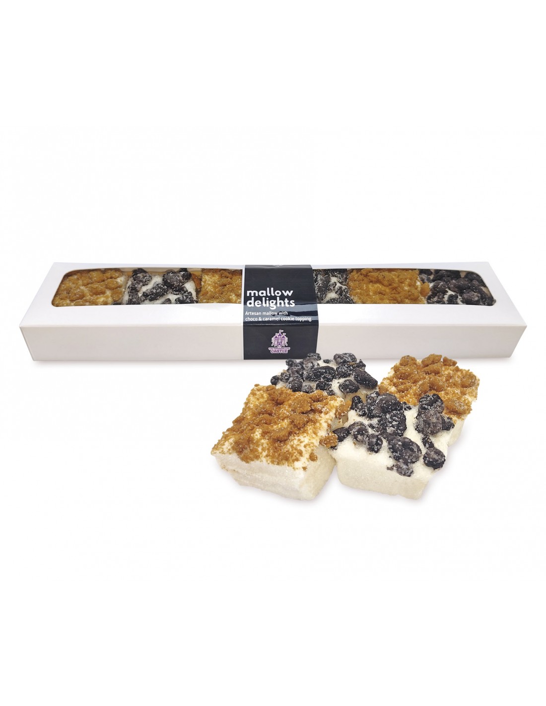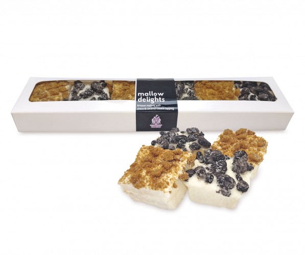 Little marshmallow squares, decorated with chocolate cookie and caramel cookie. Presented in an elegant white box with a window that shows the product.